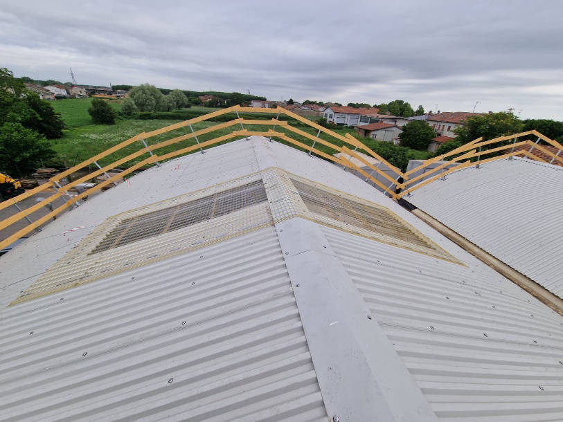A questo punto i tecnici della Garc Ambiente spa coadiuvati da Luca Lanzoni della Isolcenter srl per eliminare tutti i rischi hanno deciso di posare il sistema certificato Pasini Safety HI-VIS a protezione dei lucernari.